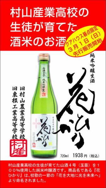 村山産業高校の生徒が育てた山酒4号(玉苗)を100%使用した純米吟醸酒です。商品名である『花ひかり』は、校歌の一節の「花を大地に光を未来へ」より命名されました。